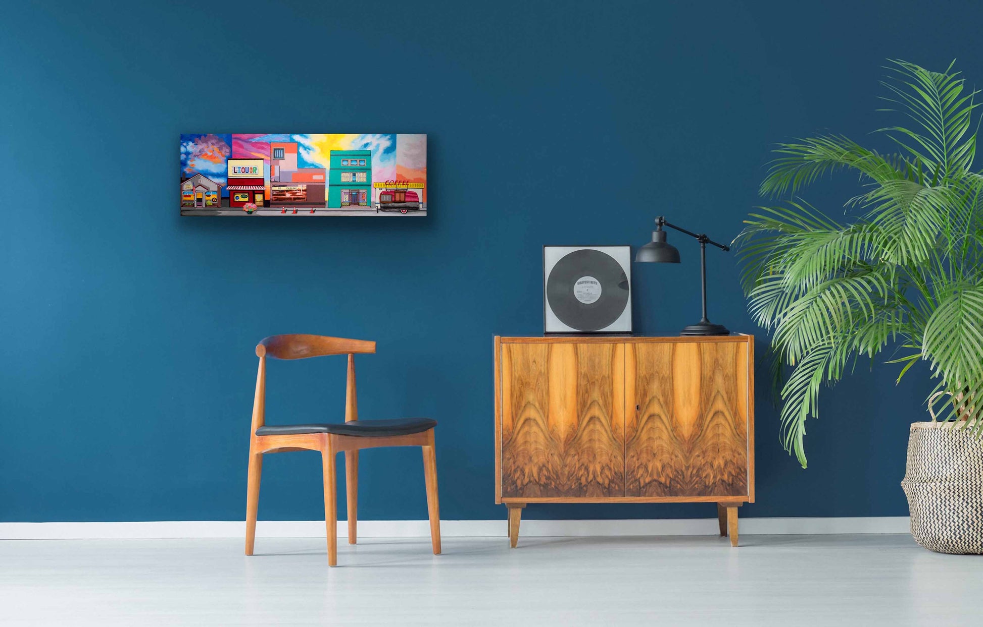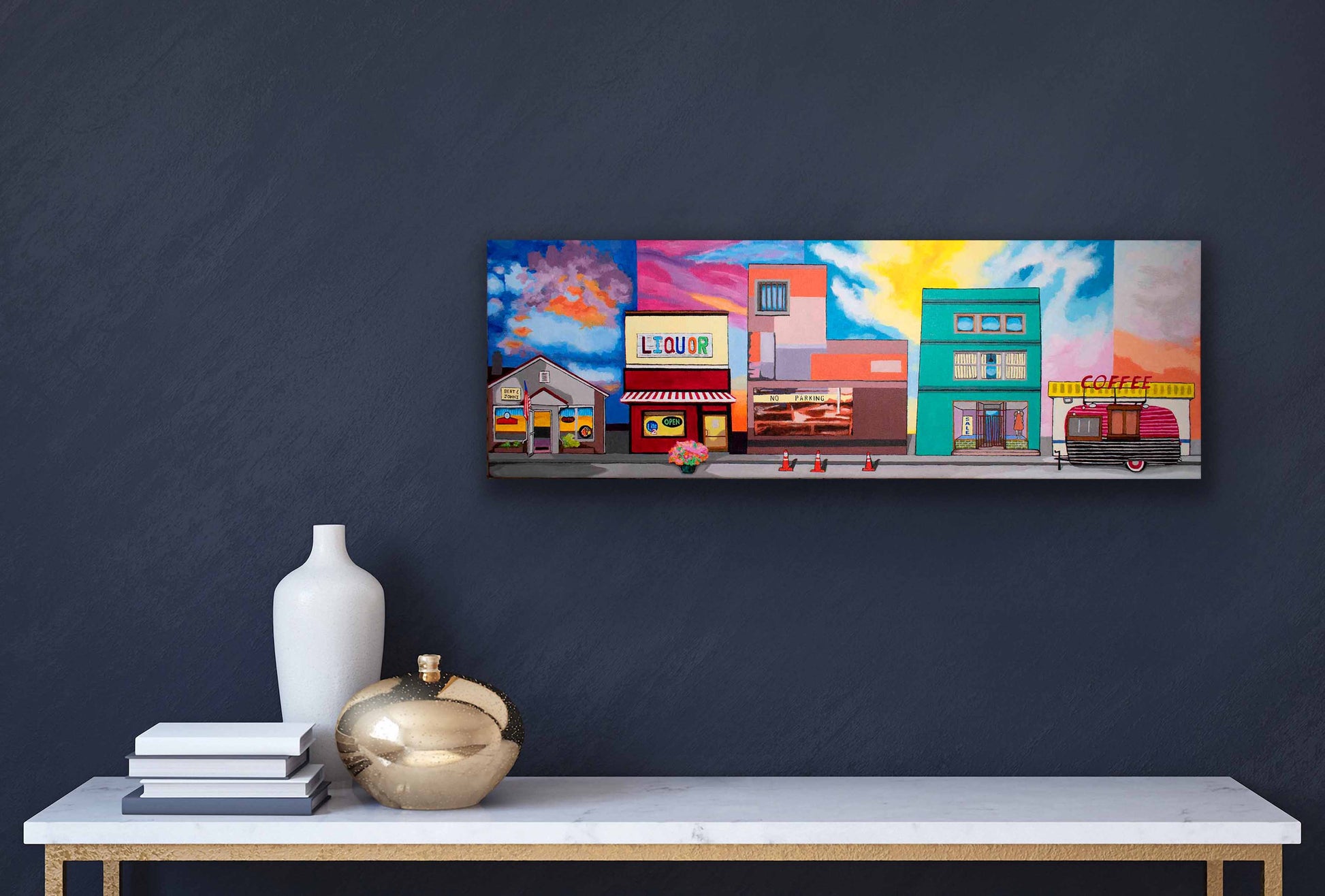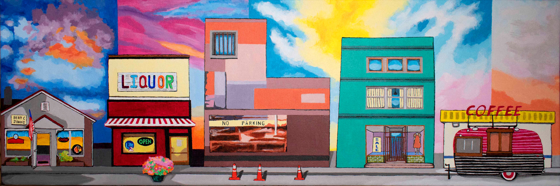 Inspired by my travels in the U.S. to cities and towns, big and small. Three of the buildings exist, and two are made up of parts of buildings (found in Pittsburgh, Pennsylvania). Bert & John's Package Goods and Tavern (far left) is in Kokomo, Indiana. Kirklin Liquor Store is based in Kirklin, Indiana. On the far right, The Coffee Steamer Trailer is in Fairbury, Illinois. This piece represents dawn to dusk, from coffee to cocktails!