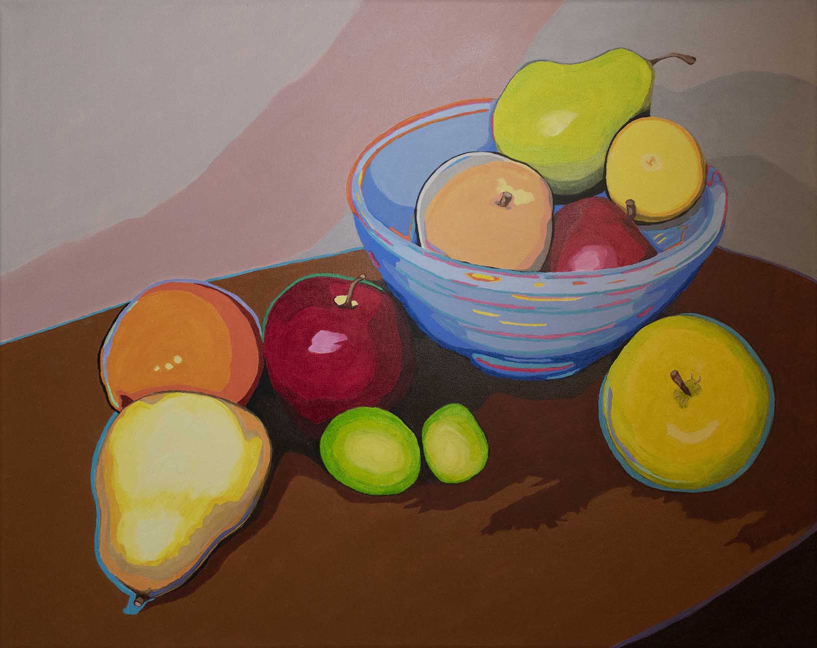 Still-Life with Fruit is inspired by the works of Peter Max and Wayne Thiebaud. Peter Max was an artist that was influential on my art when I began painting with oils at age 10. During my college years, I fell in love with the work of Thiebaud. This painting is a nod to both artists.