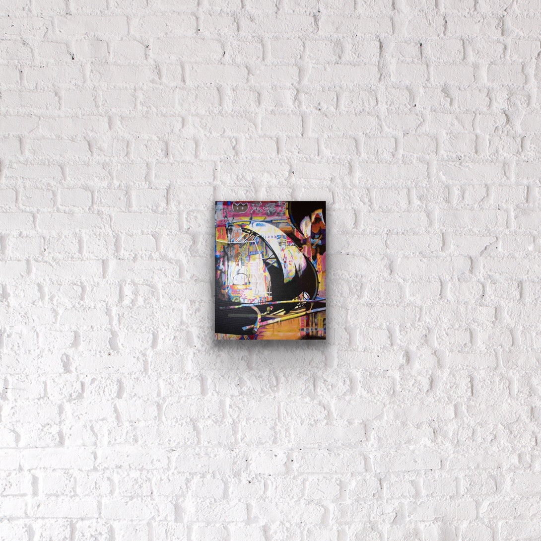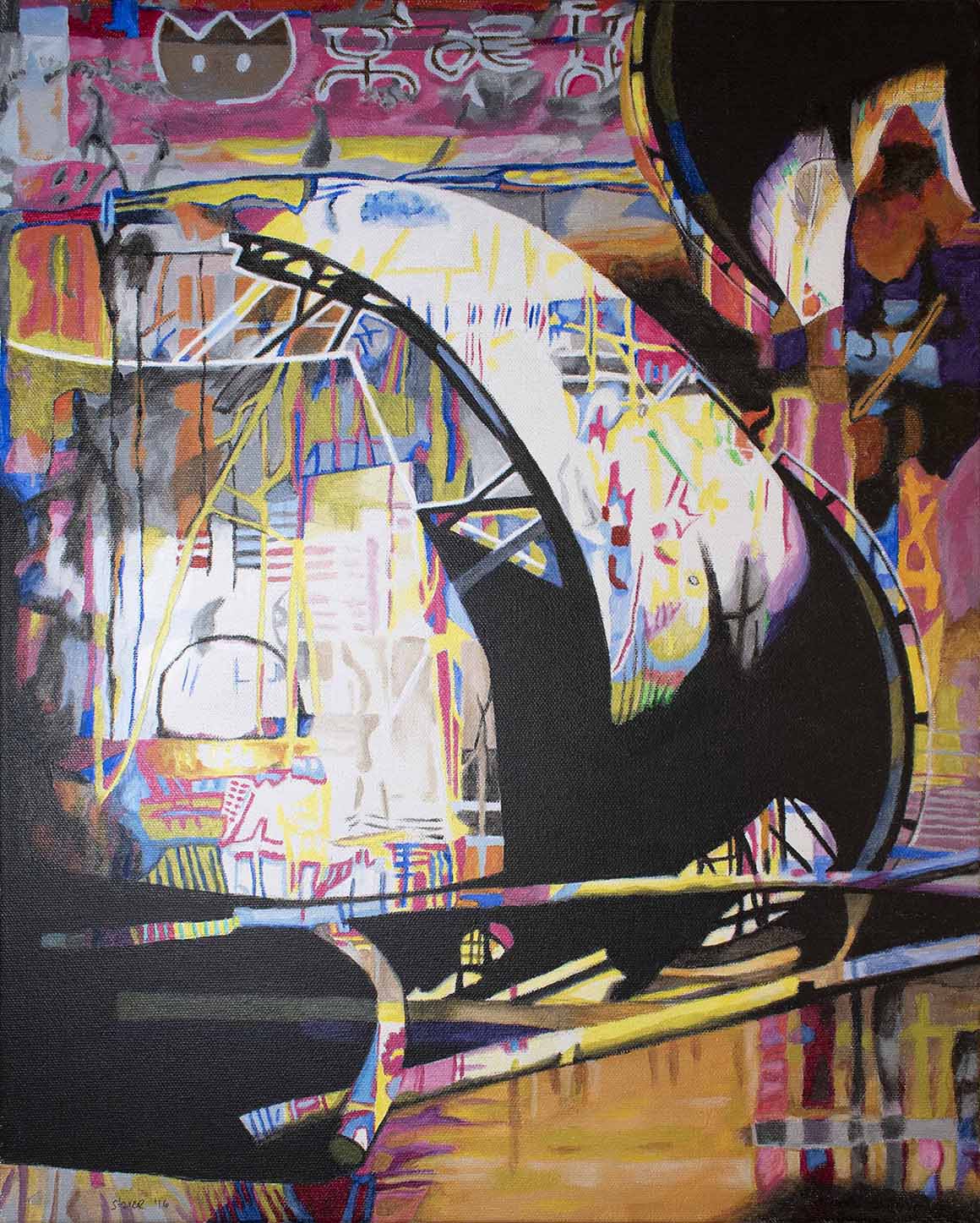 I love Chicago! The Petrillo Music Shell in downtown Chicago’s Grant Park inspired this painting. I additionally merged photos I took in Hong Kong of a storefront and a building that was being torn down in Indianapolis.