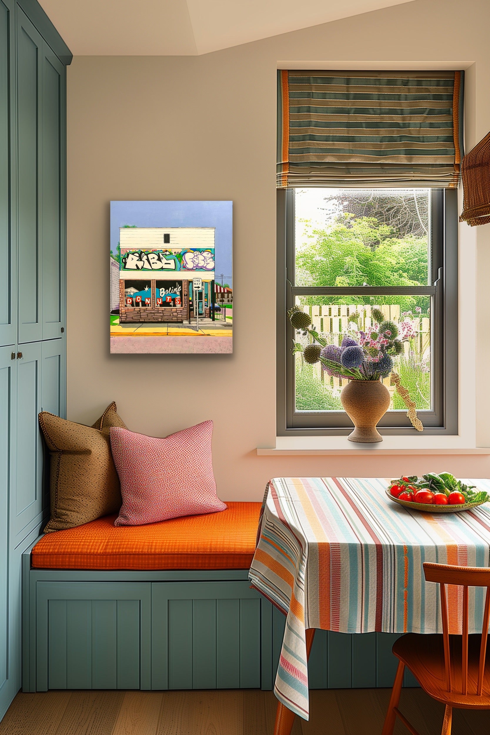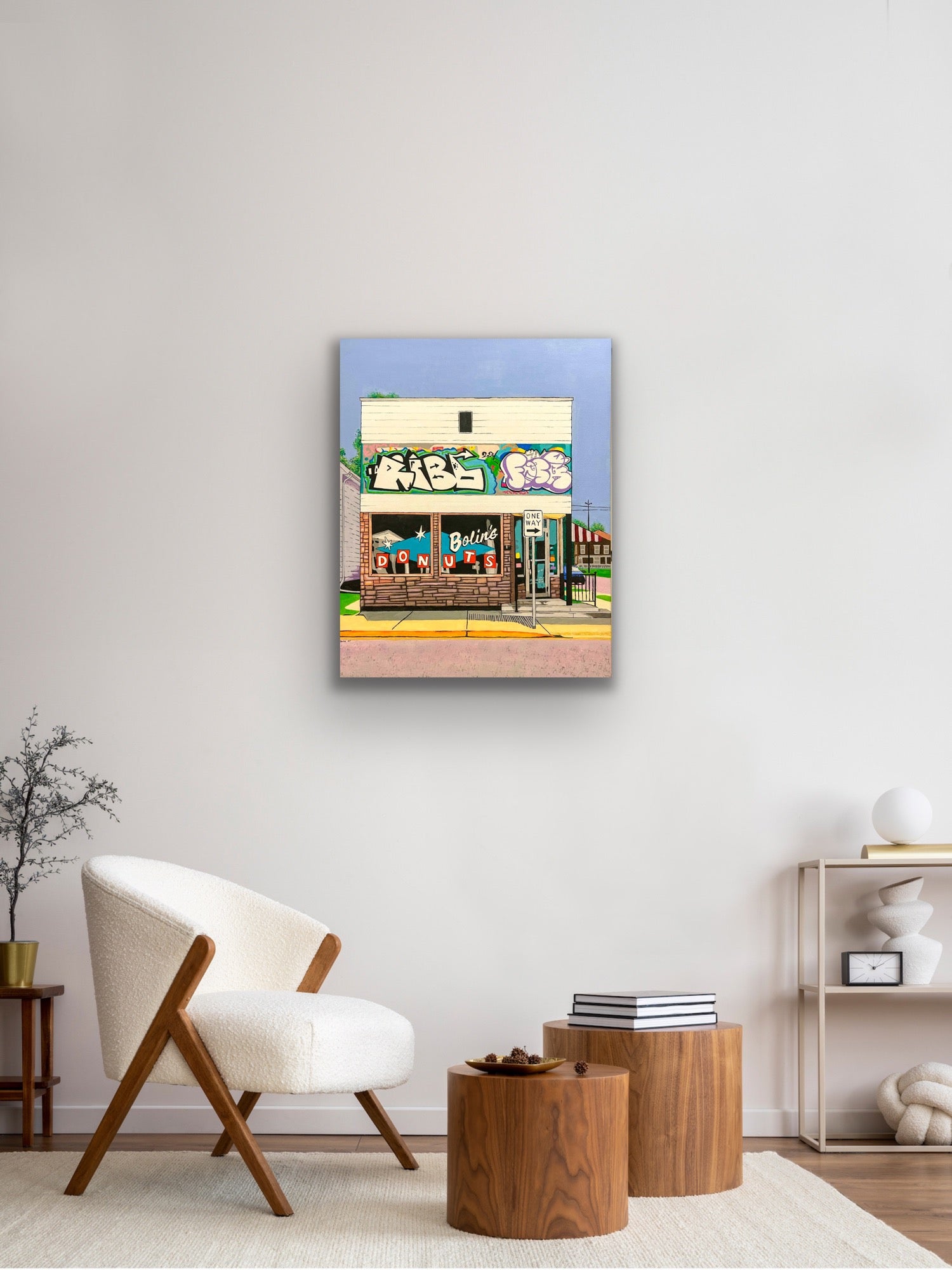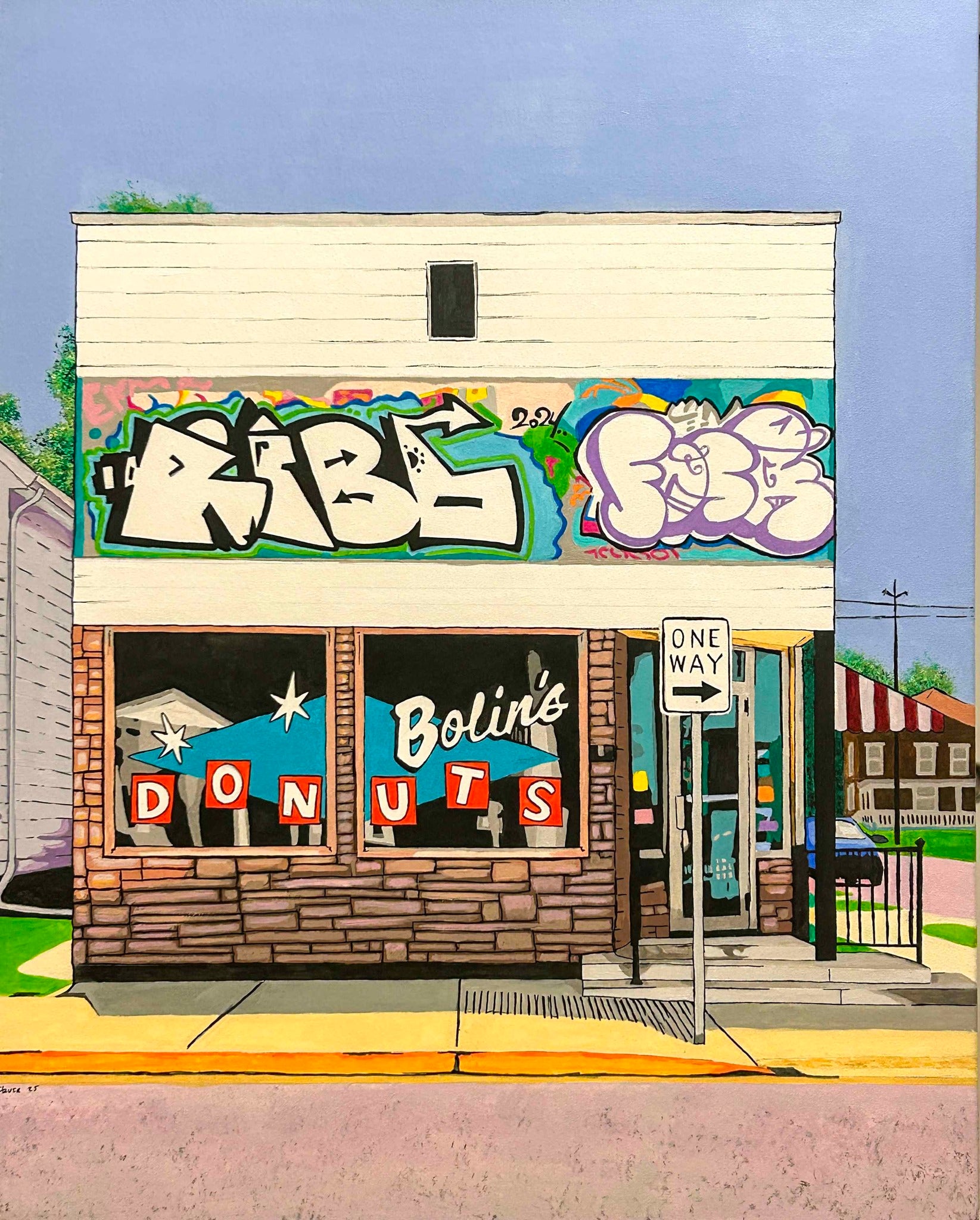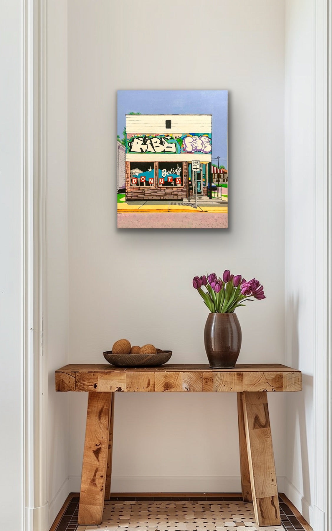 About: Logansport is located in the upper half of central Indiana. I visited the town for new painting ideas and discovered this wonderful donut shop. The graffiti was gifted to me by a person from Sweden! I loved creating the bricks which are so typical of older Indiana buildings.