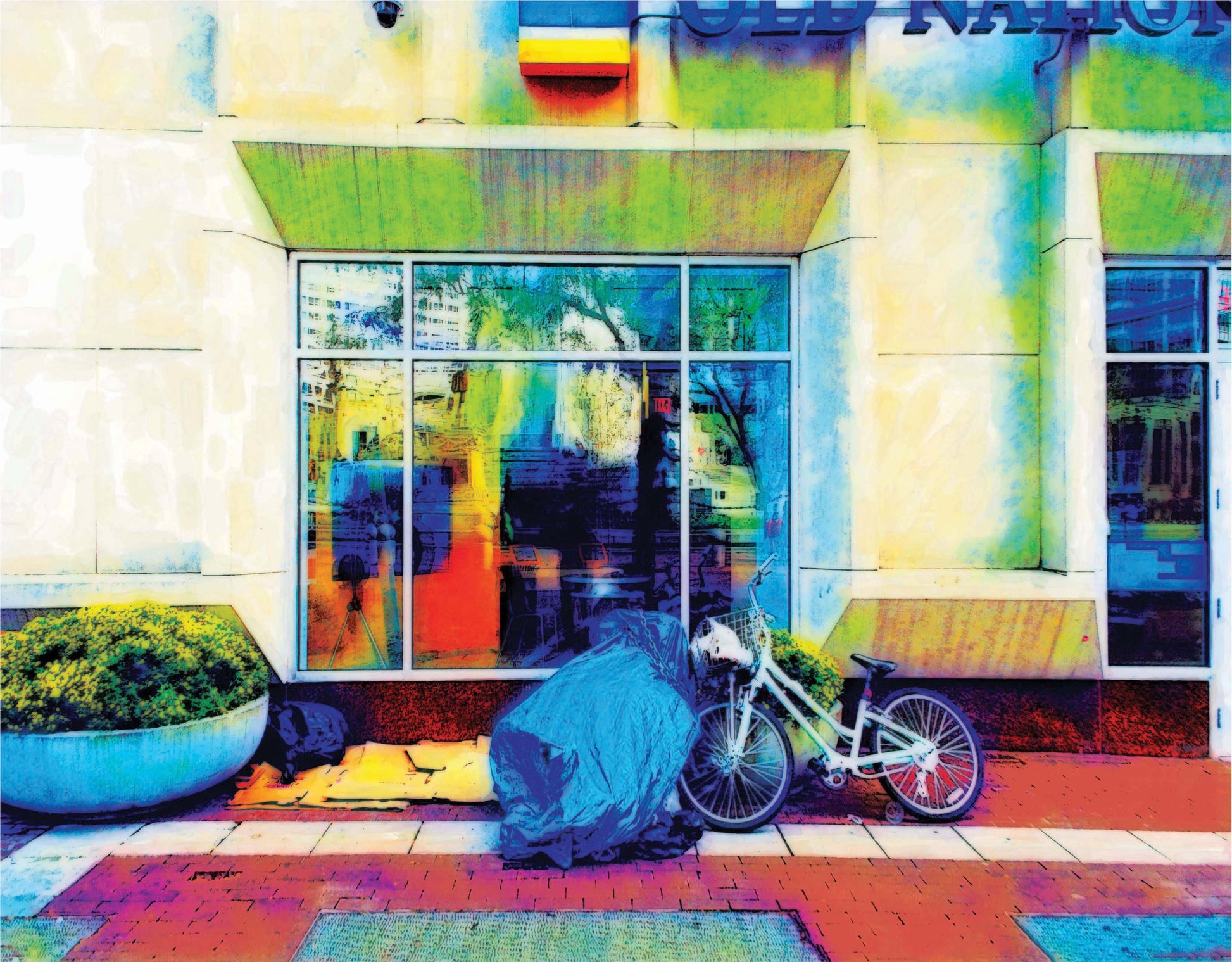 About: Sadly, like many large cities, homelessness is a part of Indianapolis. I took this photo in downtown Indianapolis. Ironically, the spot this person laid claim to is in front of a bank. I feel the bright colors, often associated with joyful feelings, oddly juxipose with the subject matter.