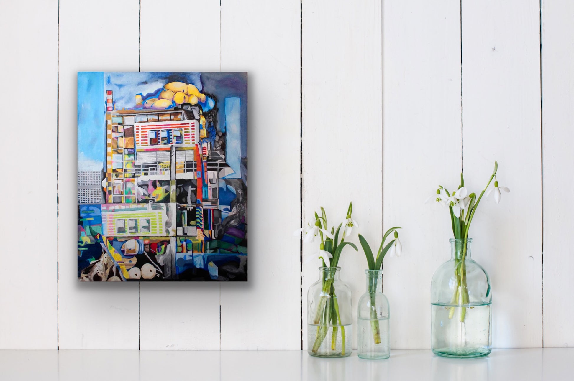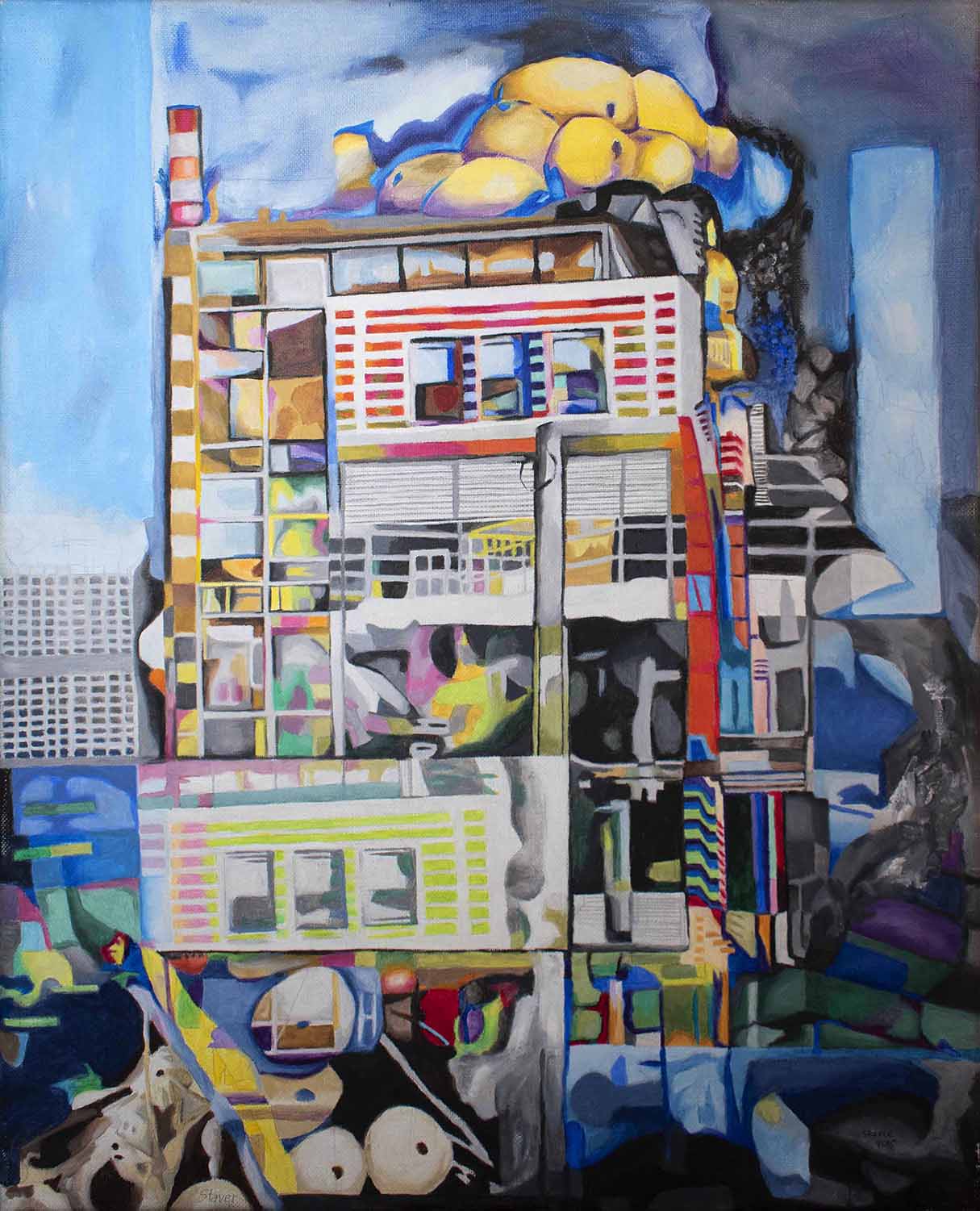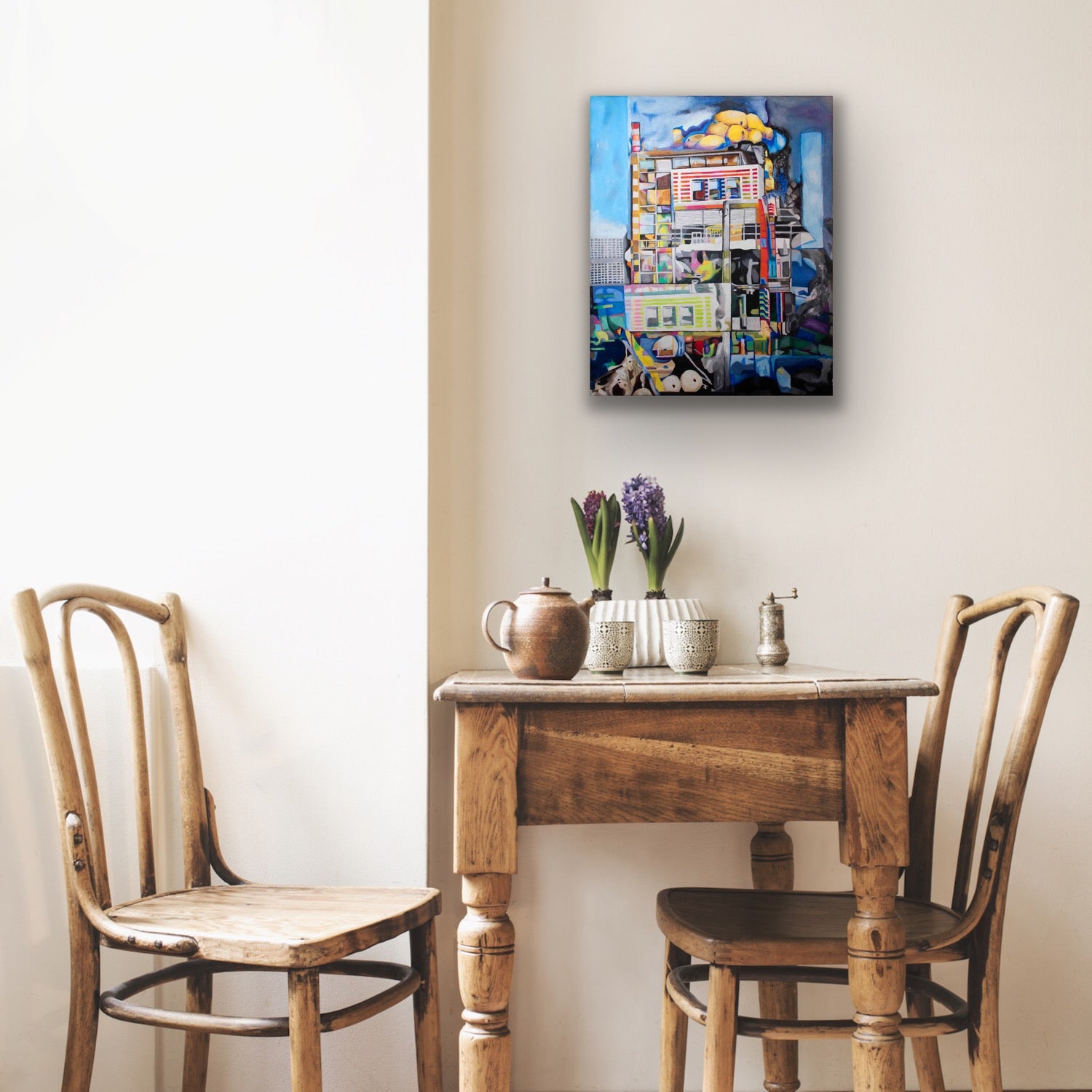 Details: Pittsburgh is an exciting city. It has undergone significant changes since the 1960s, transforming from a steel town to a vibrant city with a strong arts presence. This is from a photo I took of a building on the river. It is called CAPA 6-12, a Creative and Performing Arts Magnet school serving sixth through twelfth grades. I merged a photo of mushrooms (they resemble lemons in my painting!). I usually use only my own photos to create my art, but a long-time friend posted a photo of wild mushrooms growing on a tree stump on his land. I loved the photo and asked if I could incorporate it into a painting, and thankfully, he said yes! In my blog, "How I Work," I discuss how I created this piece.